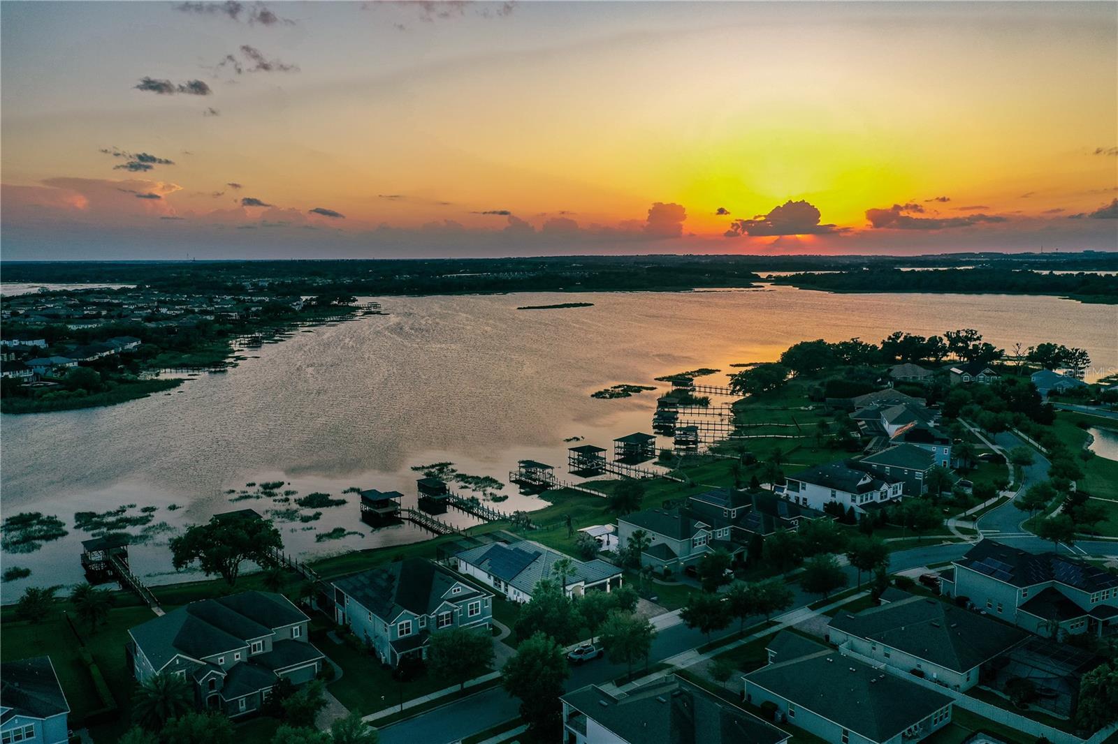 Experience true lakefront living in the highly sought-after Hickory Hammock community in Winter Garden on the shores of Johns Lake. This stunning 4-bedroom, 3.5-bath home, showcases breathtaking sunset views and a seamless blend of luxury and comfort. Inside, rich wood flooring flows throughout the main living areas and most bedrooms, complemented by custom finishes, accent walls, and an open-concept layout designed for both everyday living and entertaining. The designer kitchen features an oversized island, upgraded cabinetry, stainless steel appliances, and stylish lighting, all overlooking a spacious living area with custom ceiling details and expansive sliding glass doors framing the lake. The primary suite offers a private retreat with a custom feature wall and a spa-inspired bath with dual vanities and a large walk-in shower. Additional highlights include a built-in bar/wine area, spacious laundry room, and a dedicated fitness room with sauna. Step outside to a true resort-style setting featuring an infinity-edge pool and spa overlooking the water, an expansive screened lanai, and a fully equipped outdoor living area with fireplace, TV, spacious seating area, refrigerator, stainless steel grill, and Big Green Egg. Enjoy direct lake access from your private dock complete with boat lift and automatic enclosure, perfect for boating, fishing, and year-round waterfront living. Located in one of Winter Garden’s premier communities with top-rated schools, clubhouse, fitness center, tennis courts, and convenient access to shopping and dining, this exceptional property offers the ultimate Florida lakefront lifestyle.